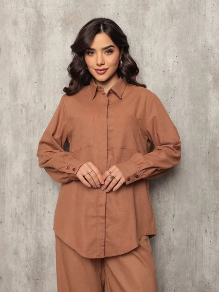Conjunto camisa e calca pantalona tecido linho com bolso frontal