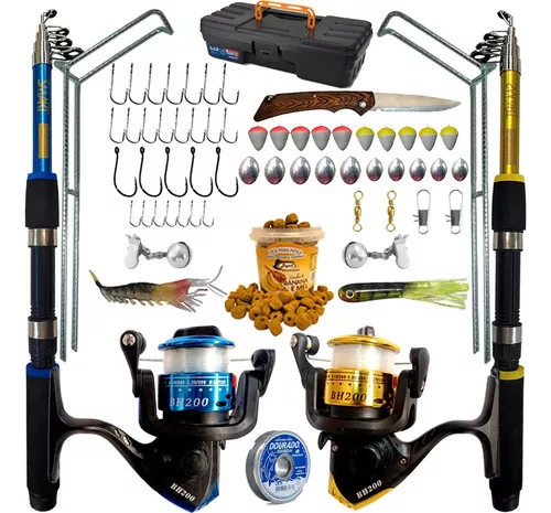 Kit de pesca completo 10kg com 2 varas + 2 molinetes + itens cor azul e amarelo
