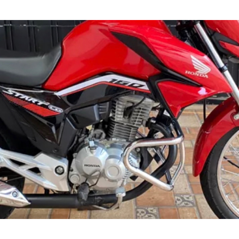 Protetor de pernas tradicional é um modelo confeccionado em aço tubular de seção arredondada, sem arestas, onde sua largura é limitada à largura do guidão. Em caso de tombamento, oferece proteção as pernas do condutor, ao passageiro e as laterais do motor da motocicleta.