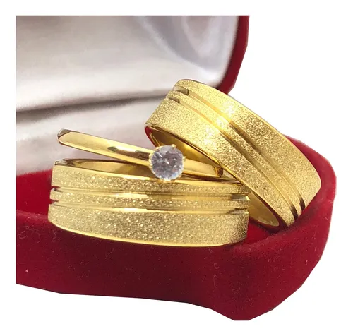 Par Aliança De Casamento Dourada Diamantada Com Frisos +anel